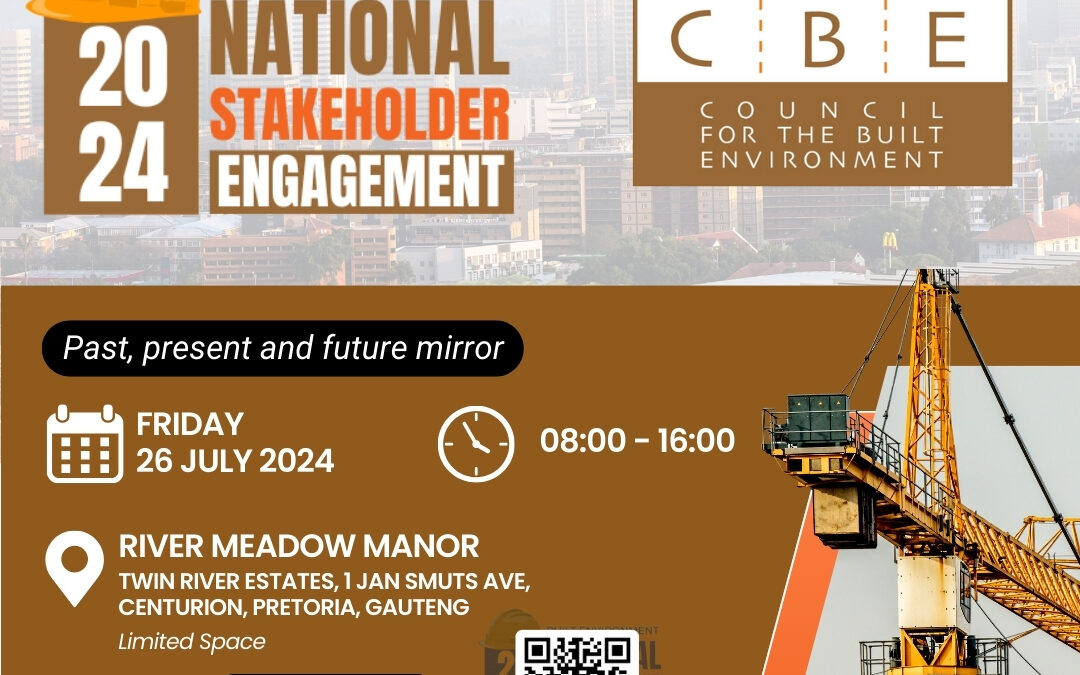 The Council for the Built Environment (CBE) is hosting a Built Environment National Stakeholder Engagement, on 26 July 2024 from 09:00 to 16:00 at the River Meadow Manor in Irene, Centurion. The theme of the event is “Past, Present and Future Mirror”